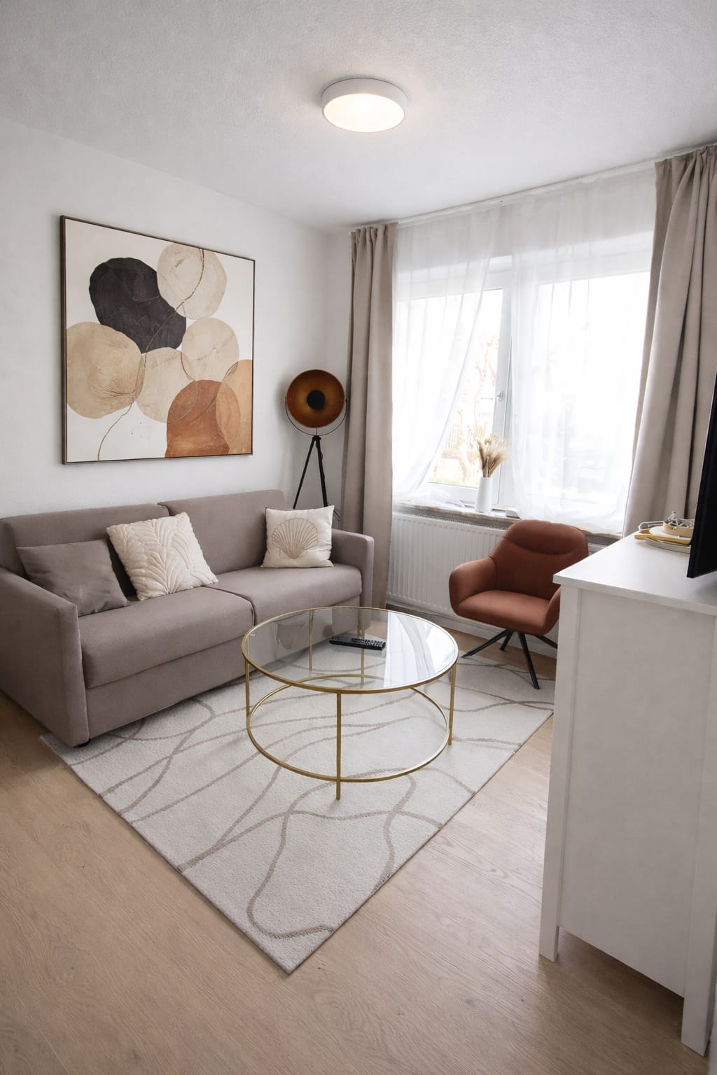 Gemütliches 2-Zimmer-Apartment mit Abendsonne. Großzügiger Wohnbereich mit Schlafsofa, Tageslichtbad und Blick auf den Leuchtturm.