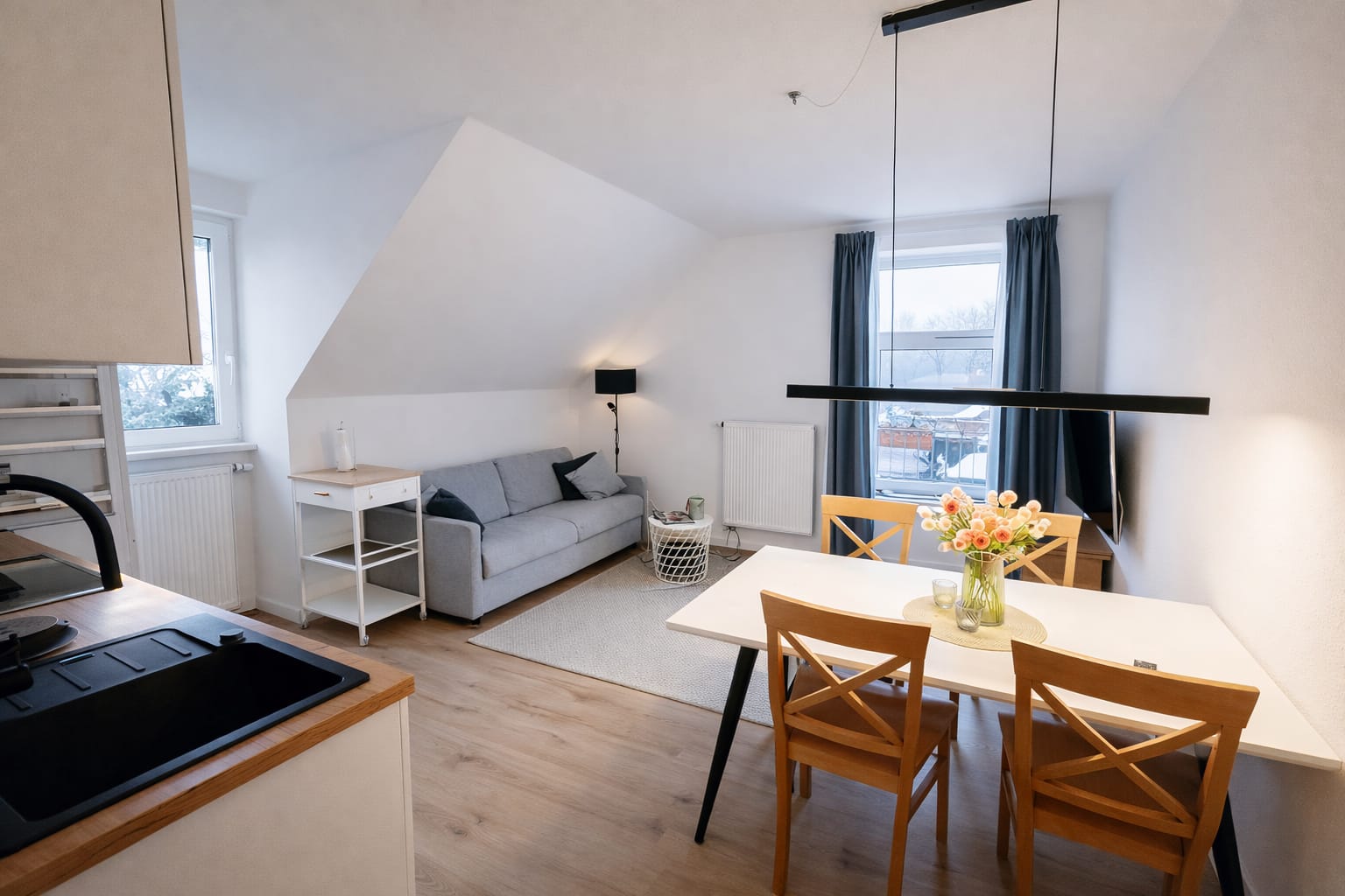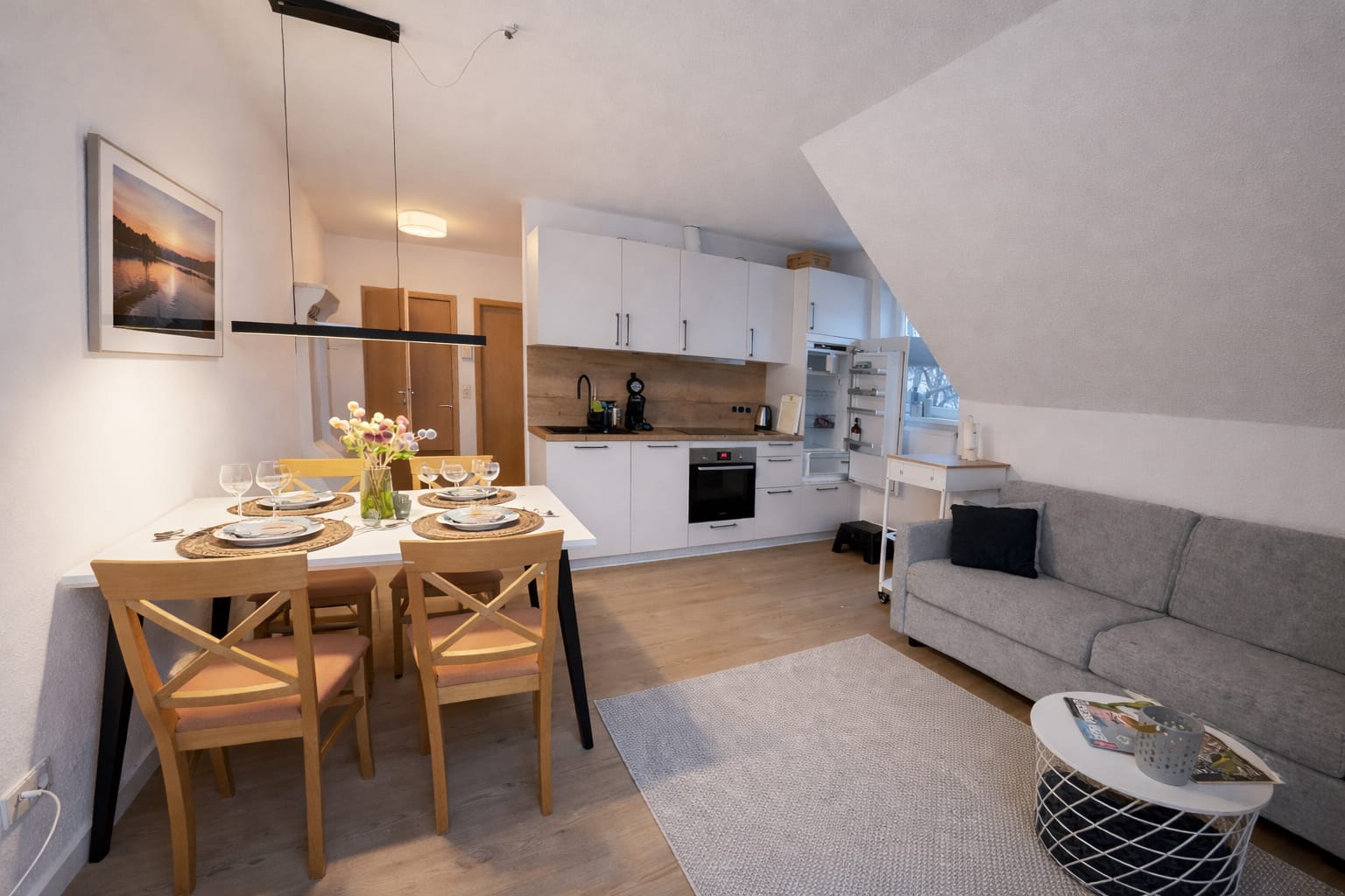 Lichtdurchflutetes 2-Zimmer-Apartment mit Südausrichtung, speziell für Gäste mit Hund oder Katze ausgestattet. Großzügiger Wohnbereich mit Schlafsofa und Tageslichtbad.